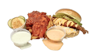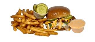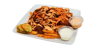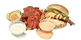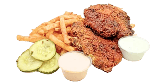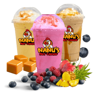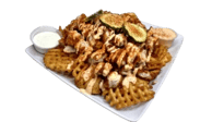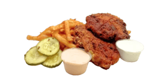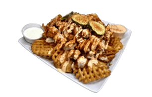 Crispy waffle fries with chopped Nashville Style Hot Chicken Tenders, Cheese and pickles. Drizzled with Nanu’s sauce