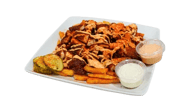 Crispy fries topped with chopped Nashville Style Hot Chicken Tenders, Cheese, and pickles and Nanu’s sauce
