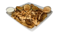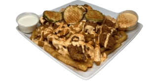 Crispy fries topped with Jumbo Shrimp, cheese, pickles and drizzled with Nanu’s sauce