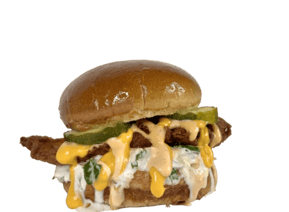 Our signature chicken tender topped with coleslaw, cheese, pickles and nanu’s sauce on a fresh brioche bun